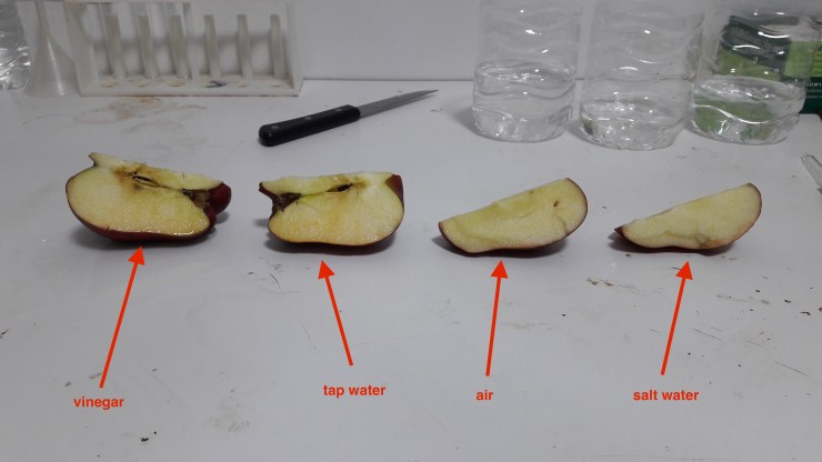 2. Dip the pieces of the apples into salt water, vinegar, tap water, and leave the last piece by itself.