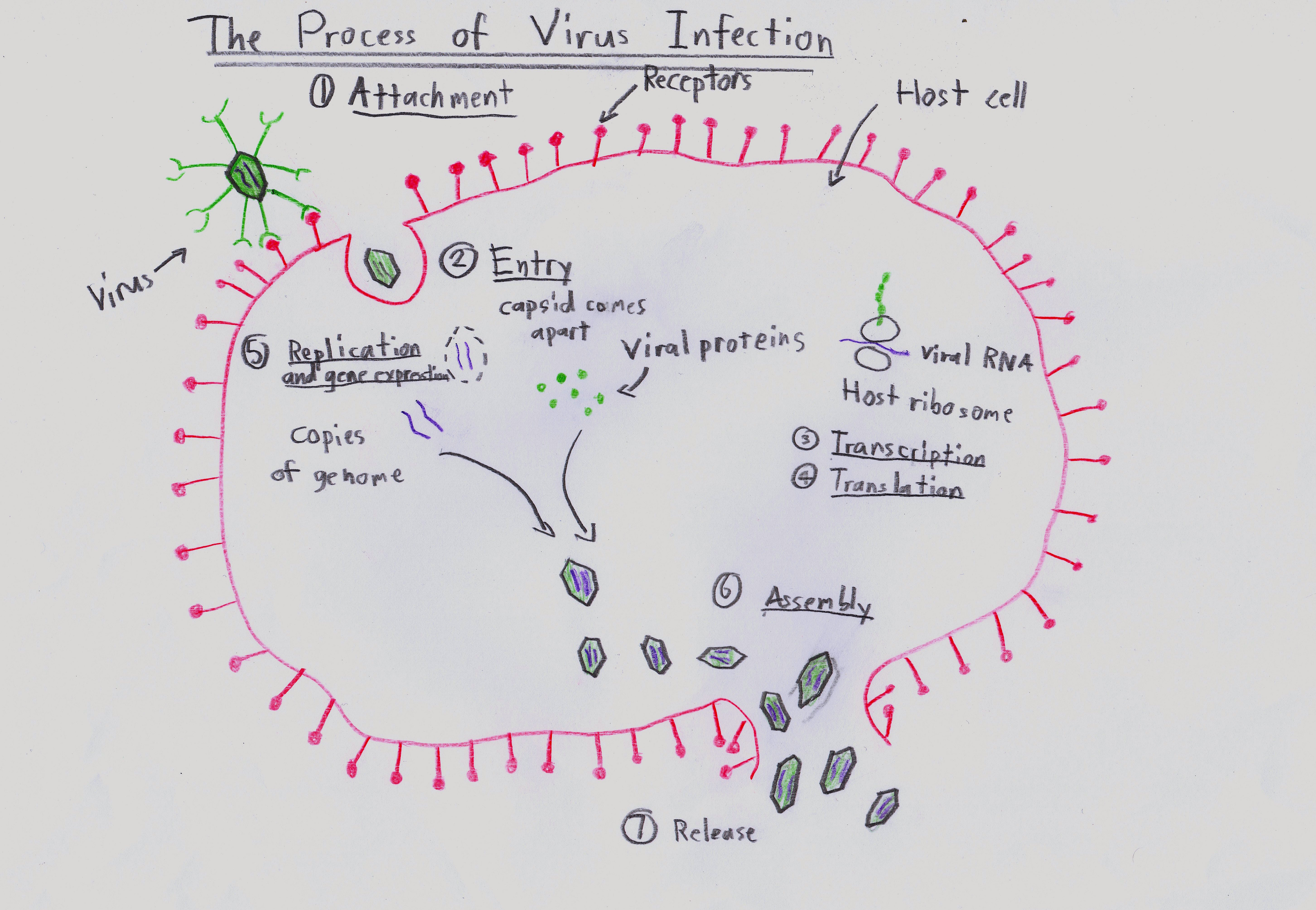 I have drawn a diagram of “The Process of Virus Infection” (my diagram is on the bottom). Viruses are cells that infect animals, plants, and bacteria and reproduce only within living cells. Viruses are considered as being either living organism or inert chemicals. The first step of virus infection is attachment. The Host cell has receptors on the cell membrane. In order for the virus to infect the Host cell, the virus needs the right receptors to match the Host cell receptors. Then it enters the host cell if the virus receptors match with the Host cell. Then the capsid of the virus comes apart. Then it transcripts and translates the viral proteins and copies the genome. And then assembles and releases many virions in the process called “Lysis”. A virion is the complete form of a virus when it is outside a Host cell.